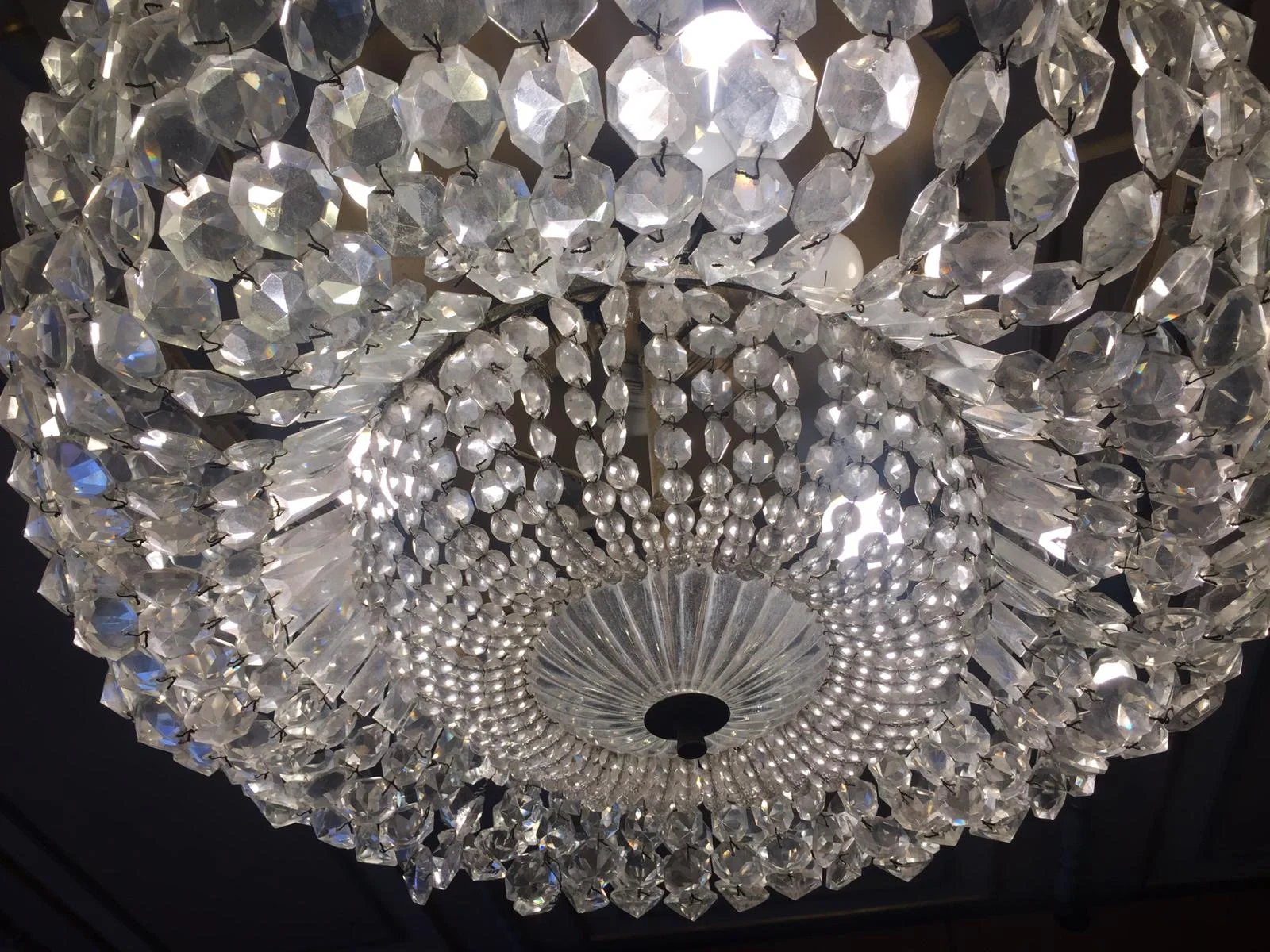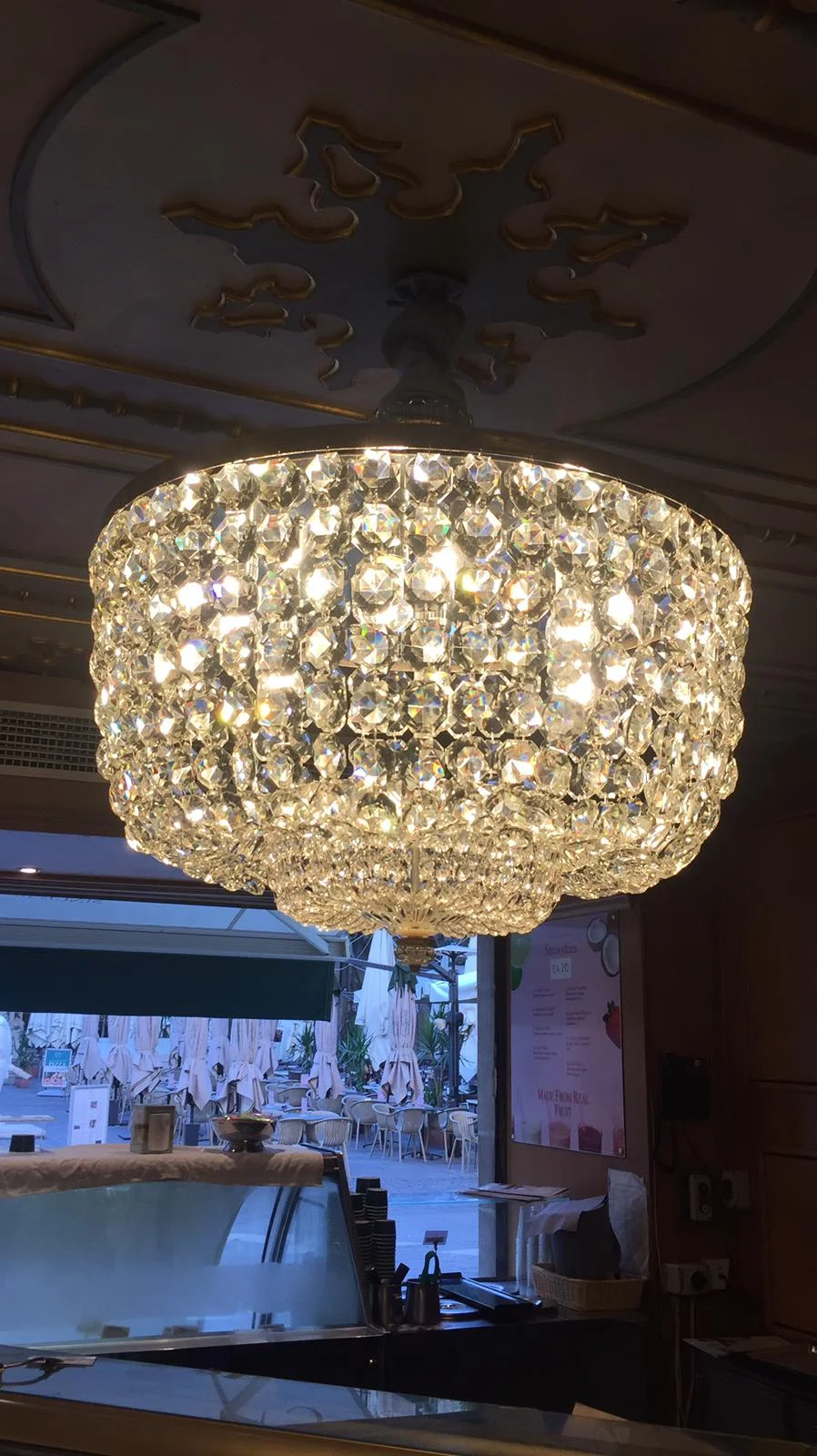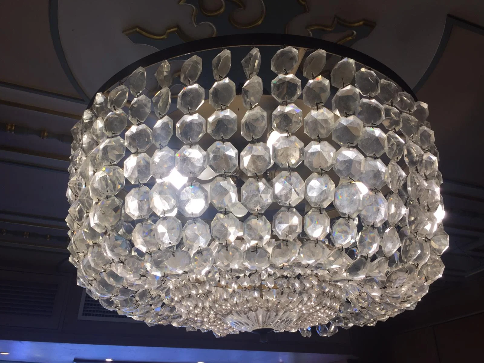 This crystal chandelier might not share the same heritage value as the Murano chandelier, nevertheless, it remains an important fixture in the cafeteria, bringing illumination but also a more contemporary look to this section of the cafeteria. The chandelier did need some realignment, but more urgently it needed to be hand cleaned to remove the debris that builds up particularly due to its close proximity to the refrigerators. We clean this chandelier annually before Christmas and each time, we are blown away by the difference the cleaning does to it.