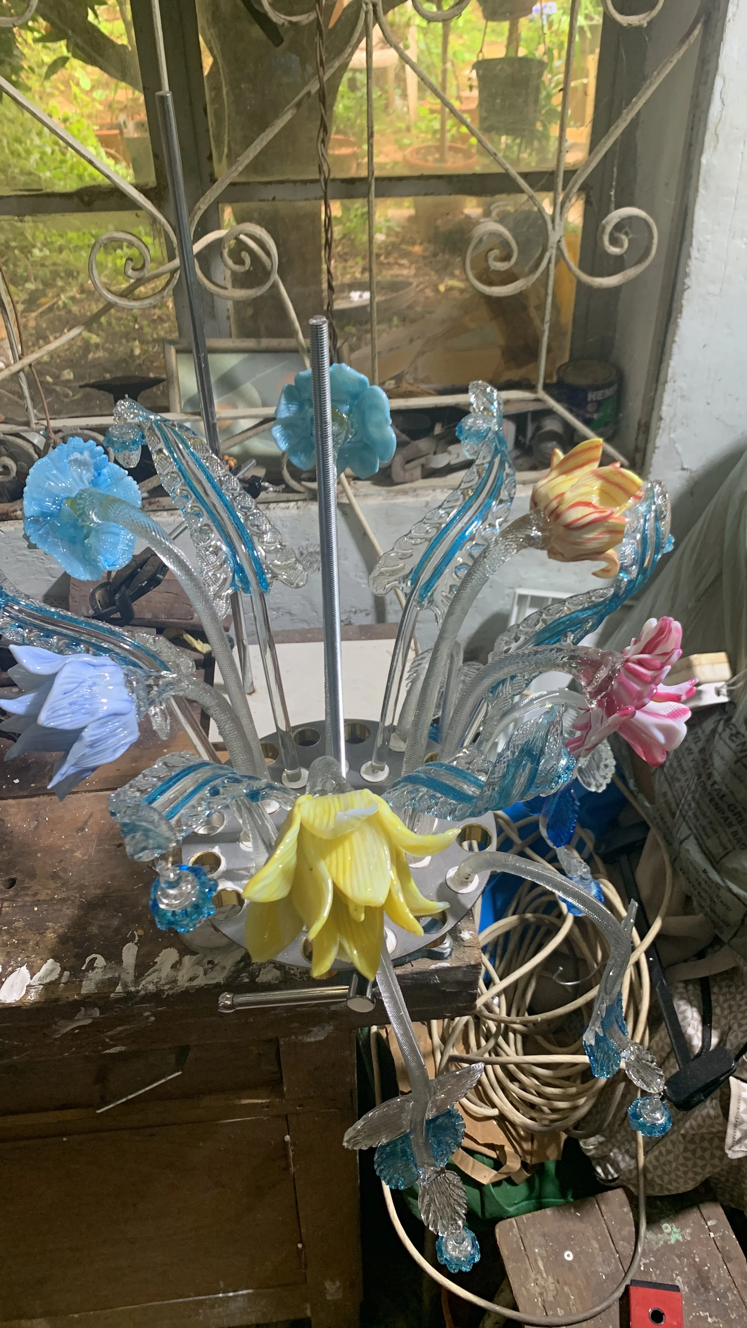 Next, the plaster is removed from the metal shells. This is a delicate process that requires careful attention to prevent any damage to the metal. Broken pieces, particularly the delicate glass flowers, were expertly restored. This involves skilful workmanship to ensure that the restoration is virtually invisible. Missing glass parts are ordered from Murano and replaced. This step is important in restoring the chandelier to its original beauty and ensures that any missing pieces are replaced with authentic Murano glass.