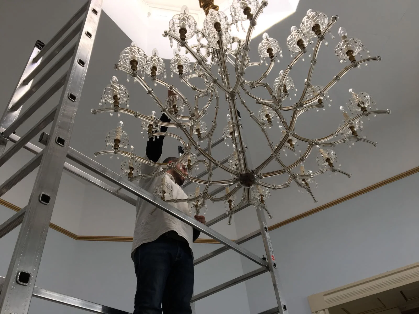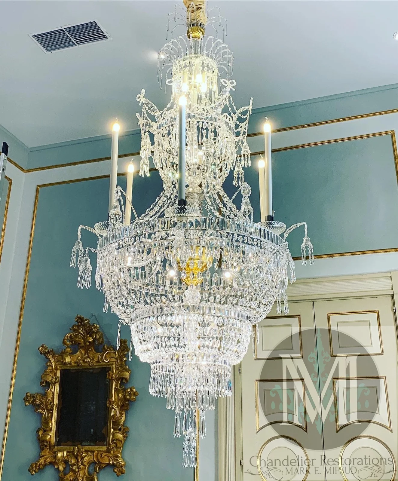 This Maria Theresa Chandelier in the newly restored hall required cleaning and some repinning in order to restore it to its original state. The finished product is a very characteristic Maria Theresa Chandelier that not only illuminates the room, but brings in it style and elegance.