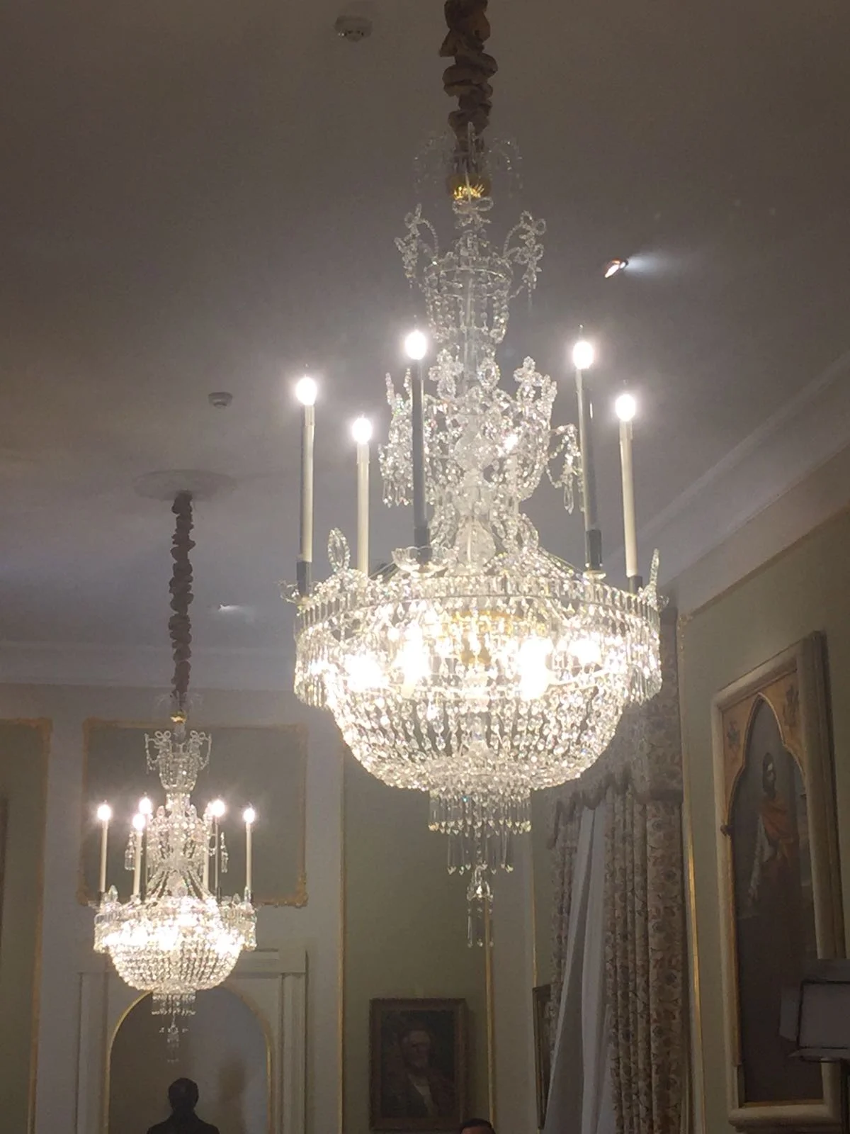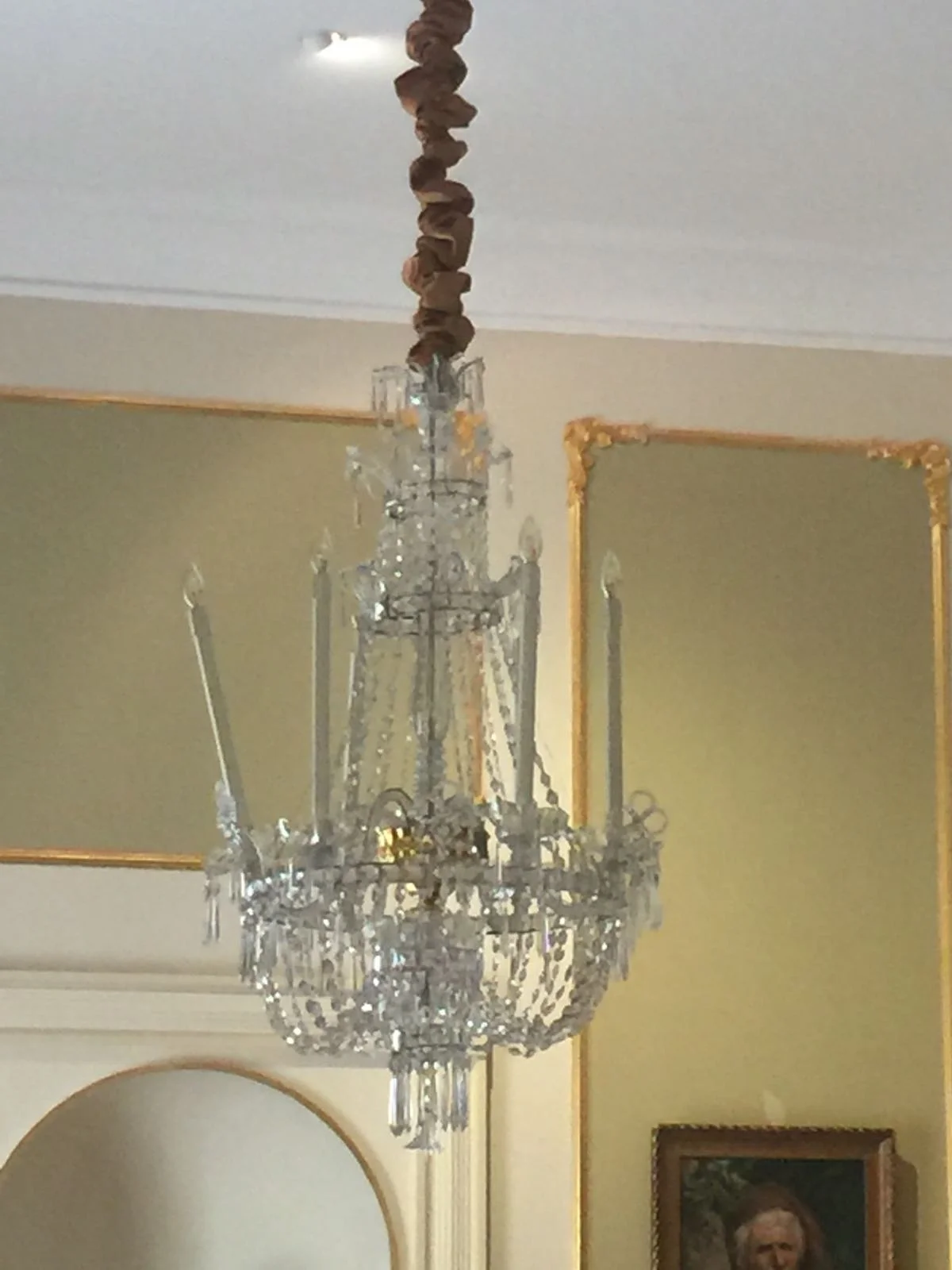The two chandeliers located in this sitting room were in a very bad state, and showed signs of amateur interventions along the years. Every single crystal had to be dismantled, cleaned and repinned in a restored design reflective of its era and to match the elegance and style of the room. The before and after photos below speak for themselves.