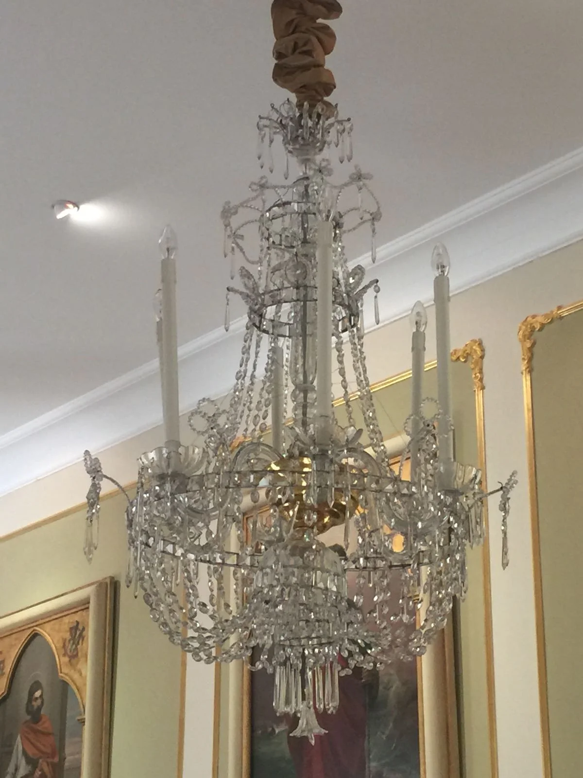 This crystal chandelier showed was showing signs of tiredness, having lost its shape considerably. The silhouette was completely asymmetrical and it was clear that several crystal parts were lost along the years, possible as a result of ageing and natural pull, but possibly also due to incorrect cleaning. The crystal was no longer clear and the lighting antiquated. This meant that the entire chandelier needed to be dismantled and the crystal pieces hand cleaned and polished individually. The chandelier was then reconstructed and given back its original shape.